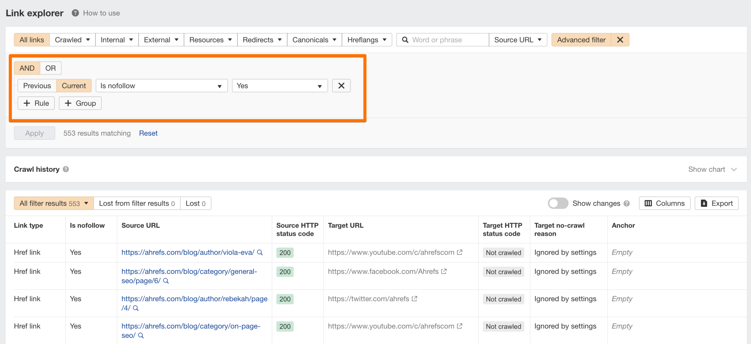يمكنك استخدام أداة Ahrefs Webmaster Tools المجانية لتحليل جميع صفحات موقعك والعثور على الروابط الصادرة التي تحتوي على وسم نوفولو، سواء كانت داخلية أو خارجية.