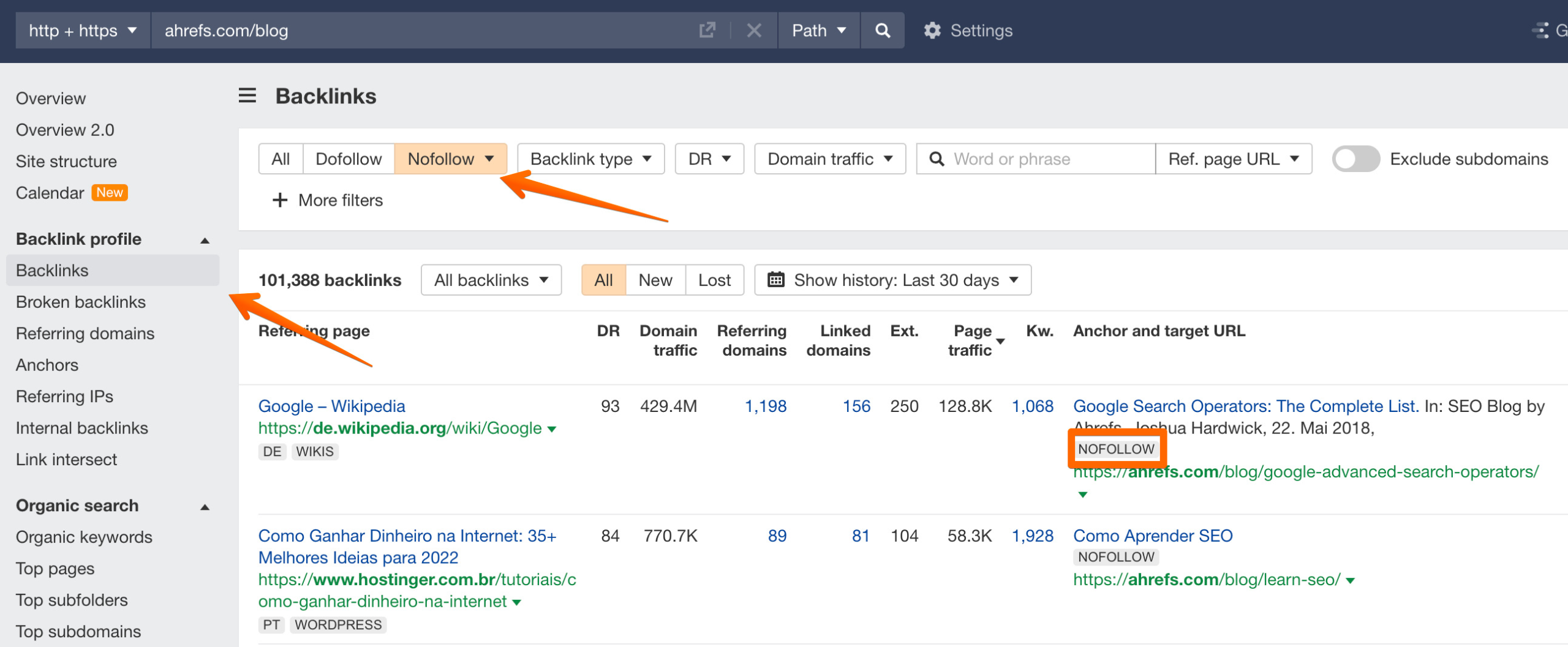 يمكنك تحديد روابط nofollow لأي موقع بسهولة عبر أداة Ahrefs Site Explorer، فقط انتقل إلى تقرير Backlinks وفعّل فلتر “Nofollow”