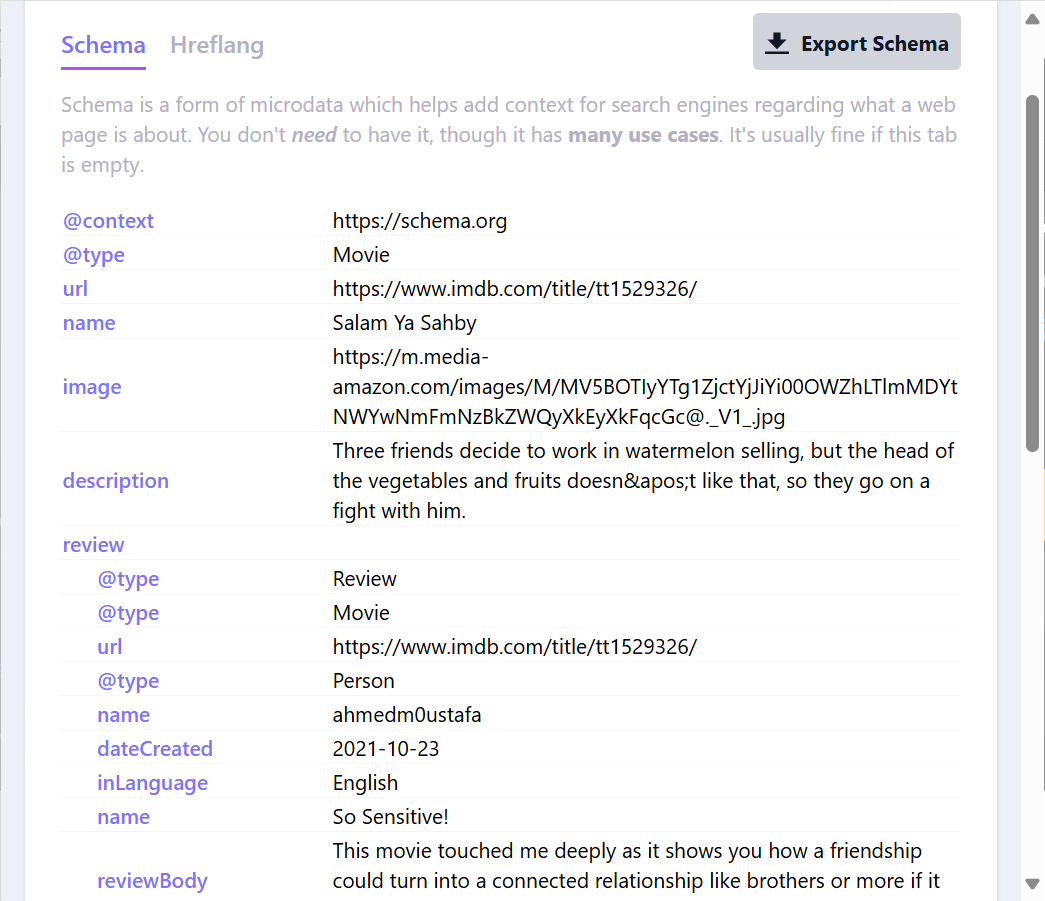 إليك مثال على ترميز المخطط Schema Markup لصفحة فيلم على موقع IMDb كما يظهر عبر أداة Detailed SEO Extension: