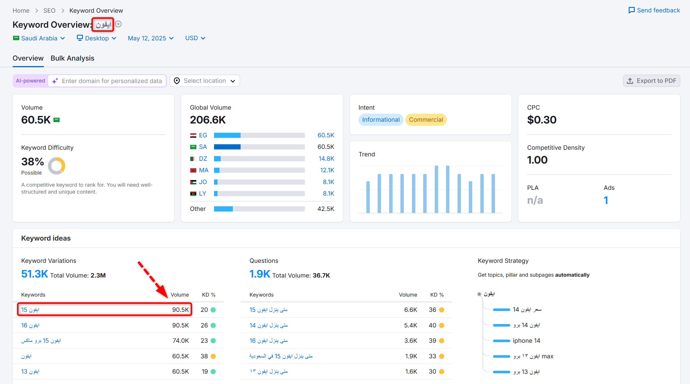 من خلال هذة الأدوات، قد تجد قائمة بالكلمات المفتاحية المتعلقة بالسياحة في تركيا – كلمات مثل “ايفون 15″، والتي يبحث عنها حوالي 90 ألف شخص شهريًا في المملكة العربية السعودية، و 143 ألف شخص عالميًا، فإذا كانت مدونتك تحتوي على مقالة تحتل مرتبة جيدة لهذه الكلمة المفتاحية، فستكون لديها فرصة جيدة للظهور في أعلى نتائج البحث، وإذا حدث ذلك، فمن المرجح أن يحصل موقعك على الكثير من الزيارات العضوية.
